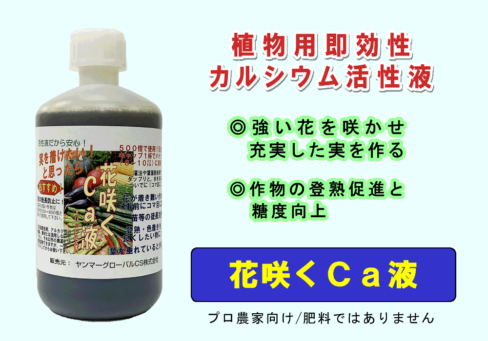 「花咲くCa液」は、多量必須栄養素であるカルシウムを供給する、液状の植物活性剤です。植物にすぐ浸透し細胞に直接働く、