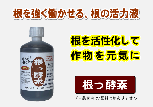- 作物は初期の生育がその後の出来に大きな影響を与えます。根っ酵素を施用すると、根張りが良くなり、植え傷みの心配がなくなります。なり疲れの予防にもなります。